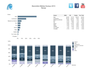 Le rapport analyse l'engagement des acteurs sur les médias sociaux entre janvier et mars 2013, en mettant en évidence les performances d'entreprises comme IKEA, Conforama, et Maisons du Monde. Les données incluent des statistiques sur le nombre de publications, de likes, et de retweets, montrant les tendances et l'interaction des consommateurs. Les résultats révèlent des disparités significatives dans les interactions en ligne entre les différentes marques.