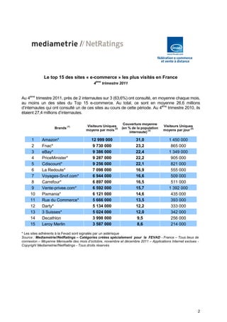 Au 4ème trimestre 2011, 30,7 millions de Français ont acheté en ligne, marquant une augmentation de 11% par rapport à l'année précédente, avec une confiance en l'e-commerce atteignant 66,5%. Le document présente également les classements des sites d'e-commerce les plus visités, avec Amazon, Fnac et eBay en tête, ainsi que des tendances montrant une féminisation des cyberacheteurs et un intérêt croissant pour les régions. Enfin, Mediametrie et la Fevad publient régulièrement ces statistiques pour analyser l'évolution du marché du e-commerce en France.