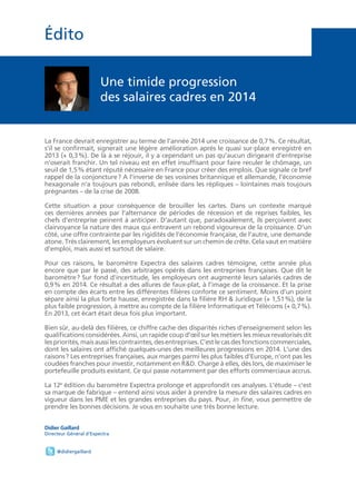 En 2014, la France prévoit une croissance modeste de 0,7 %, insuffisante pour réduire le chômage, tandis que les salaires des cadres augmentent de 0,9 %. Les disparités salariales varient selon les secteurs, avec des augmentations notables dans la comptabilité, le marketing et l'ingénierie, alors que l'informatique et les télécoms stagnent. Le contexte économique demeure prudent, freinant les investissements et intensifiant les efforts commerciaux des entreprises.