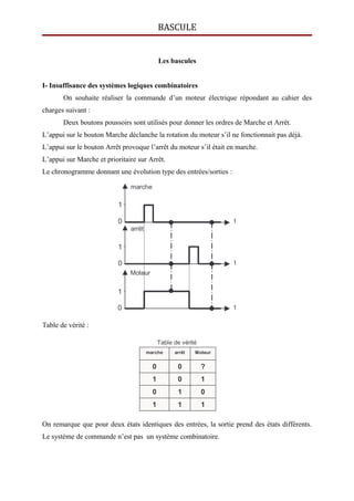 Le document traite de la commande d'un moteur électrique à l'aide de bascules dans des systèmes combinatoires et séquentiels. Il explique les différences entre les deux types de systèmes, la fonctionnalité des bascules asynchrones et synchrones, notamment les bascules RS, D et JK, ainsi que leurs conditions de fonctionnement. Le document fournit également des tables de vérité et des chronogrammes pour illustrer le fonctionnement de ces bascules en relation avec des entrées et des horloges.