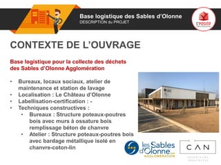 Le projet de la base logistique pour la collecte des déchets des Sables d'Olonne inclut des bureaux, un atelier de maintenance et des locaux sociaux, construits avec des matériaux biosourcés et visant une efficacité énergétique. La construction, d'une surface habitable de 1000 m², a duré 8 mois et coûté 1,7 million d'euros, tout en respectant un calendrier strict. Ce projet met l'accent sur la qualité de vie, le respect de l'environnement et un management responsable dans son développement.