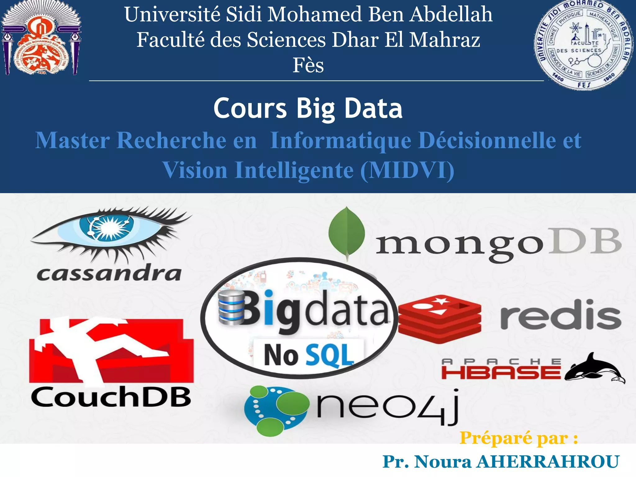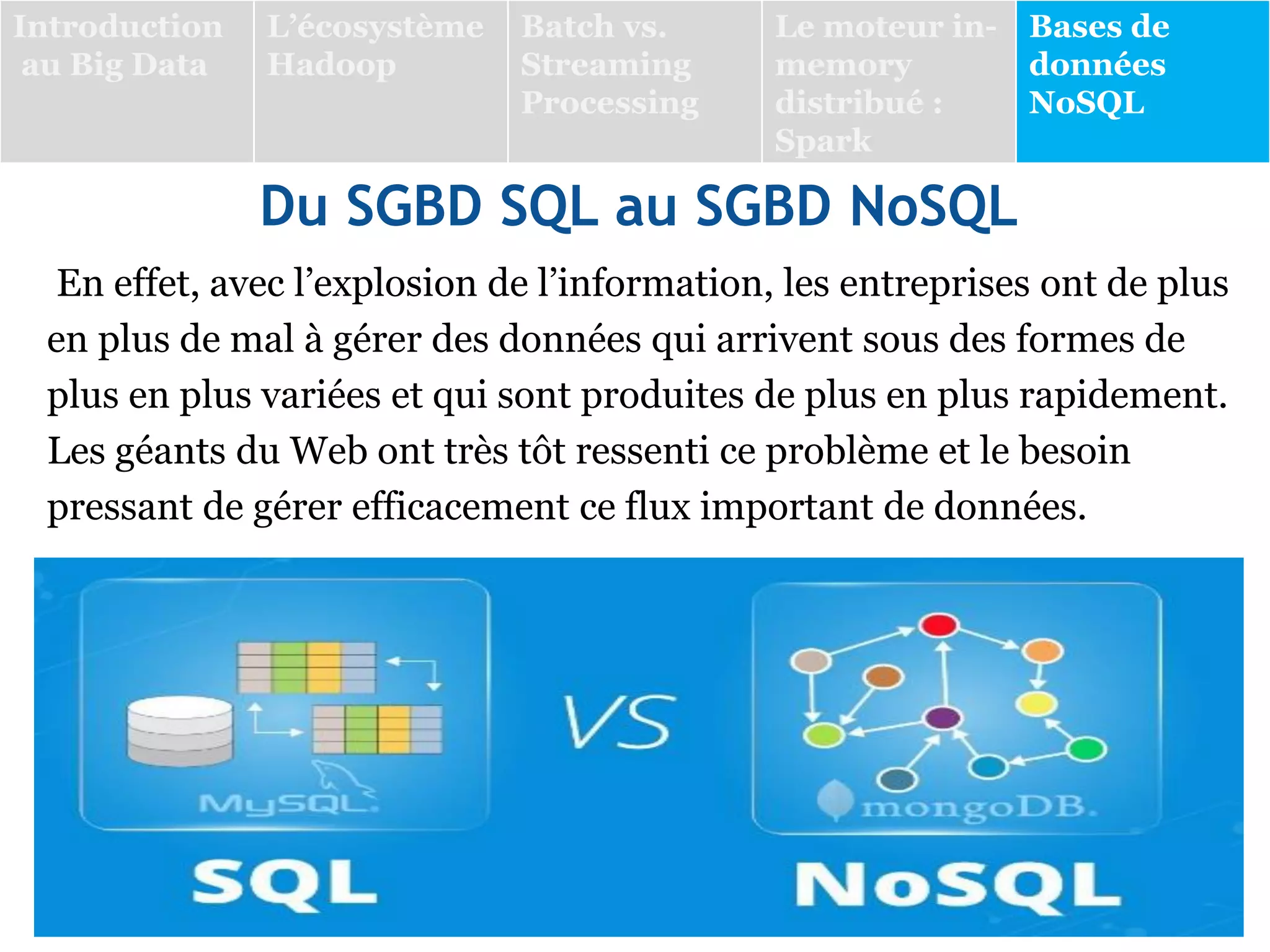 Le document présente une vue d'ensemble des bases de données NoSQL, qui émergent en réponse aux limitations des systèmes de gestion de bases de données relationnelles (SGBDR) face à la volumétrie et à la diversité des données dans un contexte de Big Data. Il décrit les différentes catégories de SGBD NoSQL, dont les bases orientées clé/valeur, documents, colonnes et graphes, en soulignant leurs caractéristiques, avantages et cas d'utilisation. Le document conclut avec des exemples de projets d'analyse de données, dont une étude sur l'épidémie de COVID-19 au Maroc.