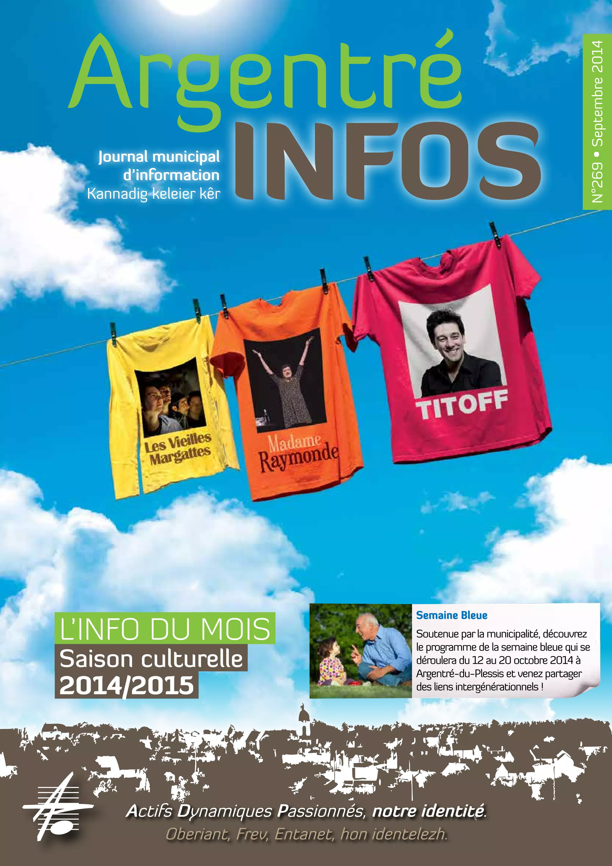 Le journal municipal d'Argentré-du-Plessis présente les événements culturels et municipaux de septembre 2014, notamment la Semaine Bleue et l'ouverture de la saison culturelle avec un spectacle de Titoff. Des informations concernant les nouvelles rythmes scolaires, les tarifs des garderies, ainsi que des appels à l'inscriptions pour diverses activités et le conservatoire de musique y sont également partagés. Le Conseil municipal a approuvé plusieurs mesures pour soutenir les associations locales et faciliter la vie des citoyens.