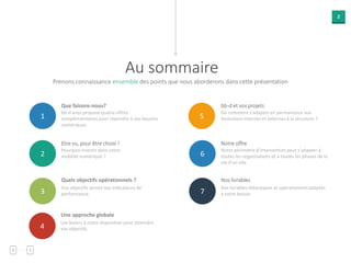 Le document présente les services de la société BB-D, spécialisée dans l'optimisation de la visibilité numérique, avec des offres en webmastering avancé et des formations digitales. Il souligne l'importance d'investir dans la visibilité numérique pour atteindre des objectifs opérationnels mesurables, en s'adaptant aux évolutions du marché et en utilisant divers leviers comme le netlinking et l'optimisation du contenu. Enfin, BB-D propose des audits et des livrables personnalisés pour améliorer la performance en ligne de ses clients.