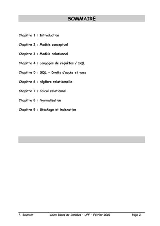 Le document présente un cours sur les bases de données, abordant des concepts fondamentaux tels que les systèmes de gestion de bases de données (SGBD), les modèles conceptuels et relationnels, ainsi que le langage SQL pour l'interrogation des données. Il explique les objectifs des SGBD, les types d'utilisateurs et les différents niveaux de représentation des données. Enfin, il couvre les langages de manipulation et les mécanismes de sécurité associés à l'accès aux données.
