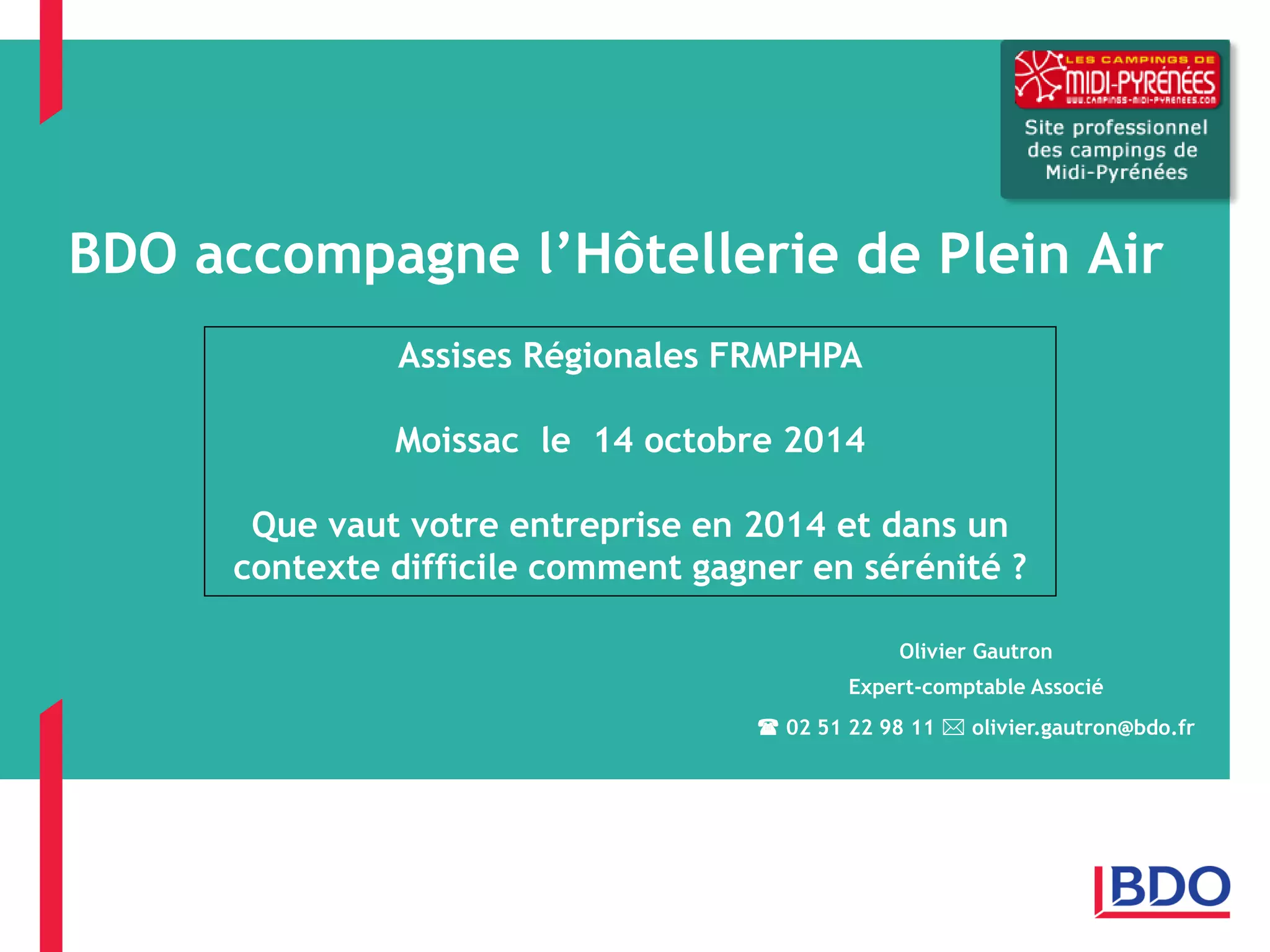 BDO analyse le secteur de l'hôtellerie de plein air (HPA) en 2014, soulignant l'importance de l'anticipation et de l'optimisation de la gestion face à un contexte économique difficile. Le document met en évidence la professionnalisation croissante du secteur, la nécessité de maîtriser des outils de gestion et l'importance d'évaluer la valeur d'une entreprise dans un marché en évolution. Des recommandations sont fournies pour aider les gestionnaires à surmonter les difficultés de trésorerie et à se préparer à une éventuelle vente de leur entreprise.