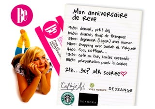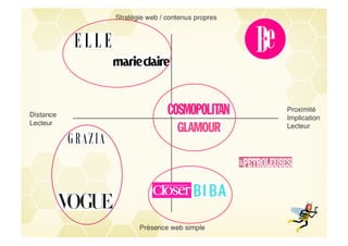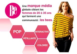 Le document décrit une stratégie de marque média globale ciblant les femmes de 20 à 35 ans, visant à créer une communauté dynamique appelée les 'bees'. Il propose des contenus plurimédias innovants, une approche trans-media et une stratégie événementielle qui renforce l'engagement des lectrices et leur connexion avec l'identité de la marque. L'objectif est de transformer la marque en une philosophie de vie quotidienne à travers des expériences partagées et des événements interactifs.