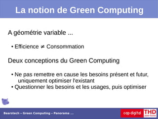 Le document présente un panorama du green computing, soulignant l'importance d'optimiser les ressources existantes sans compromettre les besoins futurs. Il aborde des concepts tels que la consommation d'énergie des datacenters, l'impact du cloud computing, et les défis de la virtualisation. Le texte conclut en évoquant des pistes pour un avenir plus durable, notamment l'utilisation de terminaux plus performants et la réflexion sur les approches P2P.