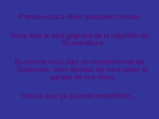 Le document évoque un rêve où une personne gagne à l'Euromillions et se décide à construire le garage de ses rêves rempli de supercars. Ce scénario fantasque se termine par des vœux pour une bonne année 2008, avec beaucoup de bonheur et de chance au loto.