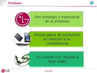 Le document analyse la performance de l'entreprise 'Life's Good', mettant en avant ses forces telles qu'une large gamme de produits et l'absence de dettes à long terme, tout en soulignant des faiblesses comme une promotion limitée au marché chilien. Il examine également les opportunités et les menaces du marché, incluant une forte dépendance aux fournisseurs étrangers et une concurrence accrue. Des comparaisons de benchmarking avec d'autres entreprises comme Samsung et Sony sont présentées pour illustrer les aspects marketing et de vente.