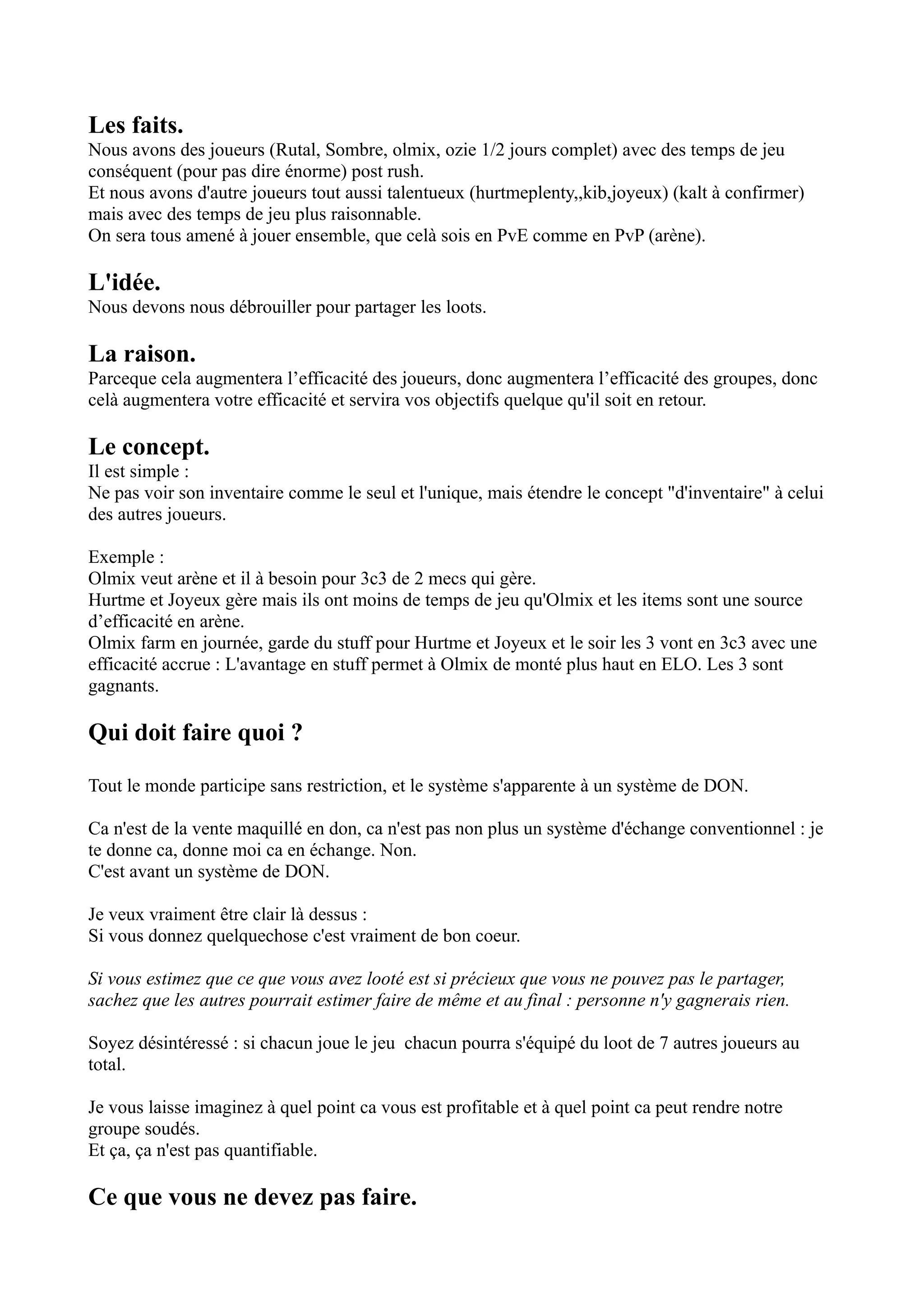 Le document propose un système de partage des loots entre joueurs pour améliorer l'efficacité collective, tant en PvE qu'en PvP. Il souligne l'importance de la solidarité et du désintéressement, tout en interdisant la spéculation sur les objets obtenus par le groupe. Des méthodologies de farming et d'échange sont suggérées pour garantir que tous les membres profitent des ressources disponibles.