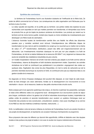 Le programme de recherche 'Repenser les villes dans une société post carbone' vise à réduire les émissions de gaz à effet de serre dans la région de Fontainebleau en développant une filière bois durable et locale. L'étude identifie des synergies entre tourisme, construction, et utilisation du bois pour le chauffage, tout en proposant un modèle de gestion durable de la forêt qui intègre les enjeux économiques et environnementaux. Les recommandations incluent la création d'industries de transformation et l'optimisation des ressources locales par des circuits courts.