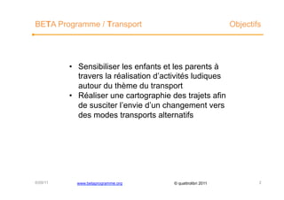 Le programme beta vise à sensibiliser les enfants et leurs parents aux enjeux du transport à travers des activités ludiques et la réalisation d'une cartographie des trajets. Des concours de dessins et de photos sont organisés pour engager les élèves, tandis que des mini-clips incitent à des changements de comportement concernant le covoiturage. L'objectif final est de réduire l'engorgement routier lié aux transports scolaires et de développer des solutions durables.