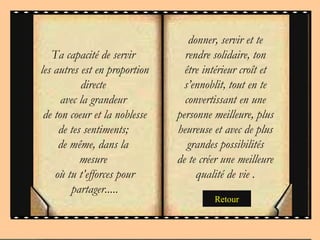 Le document aborde des réflexions sur le bonheur, la maturité et l'amour, soulignant que le bonheur vient de notre perspective intérieure et de notre engagement envers les autres. Il explique également que la maturité implique la patience, la persévérance et la capacité à faire face aux défis sans se plaindre. Enfin, il encourage à vivre une vie de noblesse et de service, en considérant notre existence comme un livre dont nous écrivons chaque jour les chapitres.