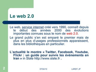 Le document présente une analyse du Web 2.0 et de ses implications dans divers domaines tels que les bibliothèques et la communication en ligne. Il aborde les outils et pratiques associés, tels que les blogs, wikis, et réseaux sociaux, ainsi que les enjeux de fiabilité et de propriété intellectuelle. En outre, il examine les avantages et inconvénients du Web 2.0, notamment la gratuité des services et les risques liés à la protection des données.