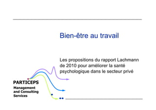 Le rapport Lachmann de 2010 propose plusieurs mesures pour améliorer le bien-être et la santé psychologique des salariés dans le secteur privé. Parmi celles-ci, l'engagement de la direction, la formation des managers et l'importance du dialogue social sont essentiels. Il souligne également l'importance d'un accompagnement des salariés et d'une prise en compte des impacts humains dans les changements organisationnels.
