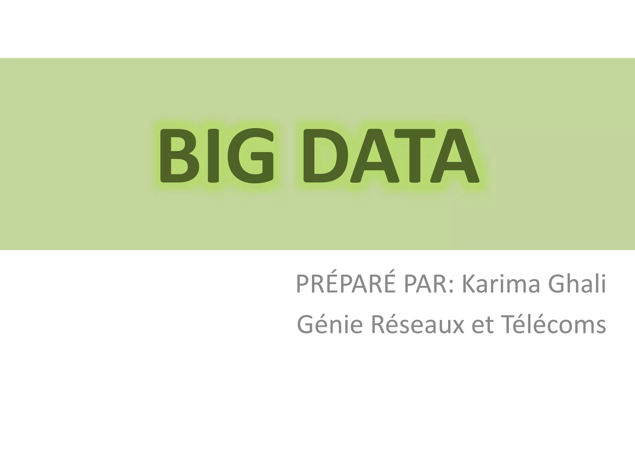 Le document traite des big data, définissant leur ampleur et décrivant leur évolution, avec des statistiques sur leur génération par des plateformes comme Facebook et Twitter. Il aborde les caractéristiques des big data, leur manipulation à travers des outils comme Hadoop, et explore des applications concrètes dans divers domaines tels que la santé et l'optimisation des entreprises. Enfin, il mentionne les avantages, les risques liés à leur utilisation, ainsi que le potentiel économique futur qui en découle.