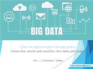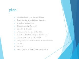 Le document traite de l'évolution du big data, son impact sur le monde numérique et les défis associés à la gestion des données massives. Il présente les caractéristiques du big data à travers les concepts des 4V et 8V, ainsi que les technologies de stockage et de traitement, notamment Hadoop et ses fonctions MapReduce. Les perspectives d'utilisation des données sont également explorées, mettant en lumière leur importance dans divers domaines tels que l'analyse politique et le marketing.
