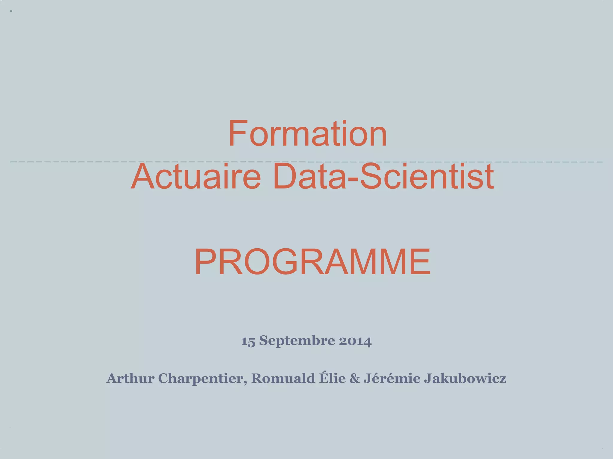 Le document présente un programme de formation pour devenir actuaire data scientist, débutant en septembre 2014, comprenant divers modules sur la programmation, le datamining, et le machine learning. La formation se déroule sur plusieurs mois avec des cours théoriques et des projets pratiques, visant à appliquer des compétences en data science à des problématiques actuarielle. Les participants devront réaliser un projet avec soutenance et passer des examens pour obtenir le diplôme de l'institut du risk management.