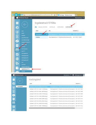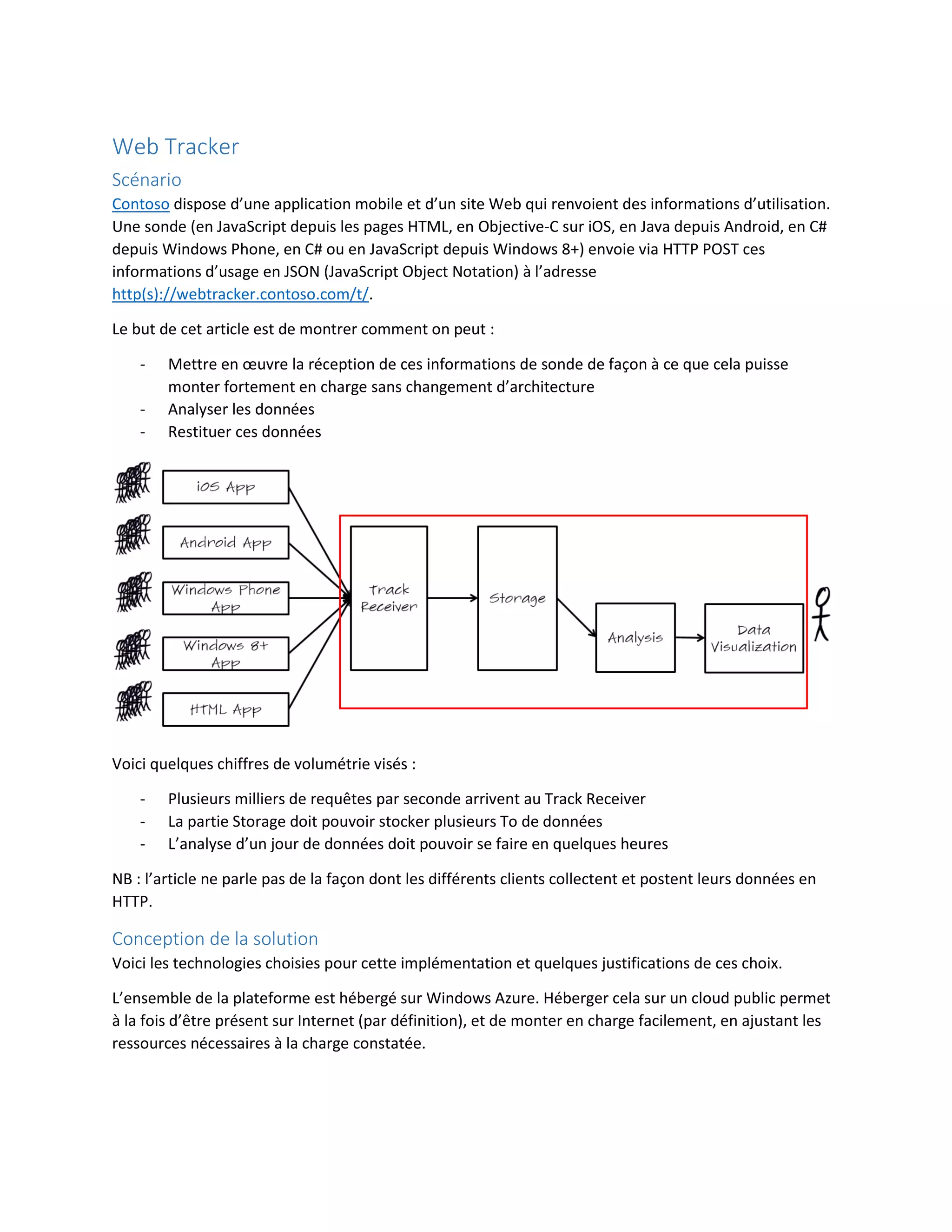 Le document décrit la mise en œuvre d'un système de suivi d'utilisation des applications mobiles et des sites web via un tracker web sur Windows Azure, capable de gérer des milliers de requêtes par seconde et de stocker plusieurs téraoctets de données. Il détaille les technologies utilisées, notamment les rôles Web et Worker dans Azure, le stockage Blobs pour les données, ainsi que l'analyse des données avec HDInsight et Hive. Le document fournit également des instructions sur la configuration et le déploiement du système, en utilisant Visual Studio et PowerShell.