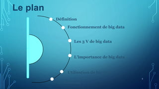 Le document traite du Big Data, défini comme l'ensemble des données numériques générées par les technologies modernes, et souligne son importance pour les entreprises grâce à ses trois dimensions principales : volume, vitesse et variété. Il met en avant les avantages du Big Data, tels que l'économie de coûts, l'innovation de produits, et la compréhension des marchés, tout en évoquant la nécessité d'une réglementation pour protéger la vie privée. Enfin, une variété d'applications dans des secteurs comme le e-commerce, la santé et les médias est présentée.