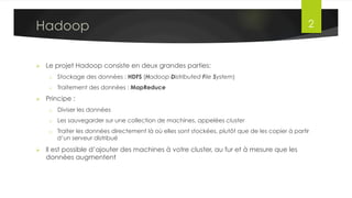 Le document présente l'architecture et le fonctionnement du framework Hadoop, qui comprend le système de fichiers distribué HDFS et le modèle de traitement MapReduce. HDFS permet de stocker de grandes quantités de données sur un cluster, tandis que MapReduce facilite le traitement parallèle de ces données. Plusieurs outils et composants, tels que YARN et des bibliothèques comme Pig et Hive, viennent compléter Hadoop pour simplifier l'extraction, le stockage et le traitement des données.