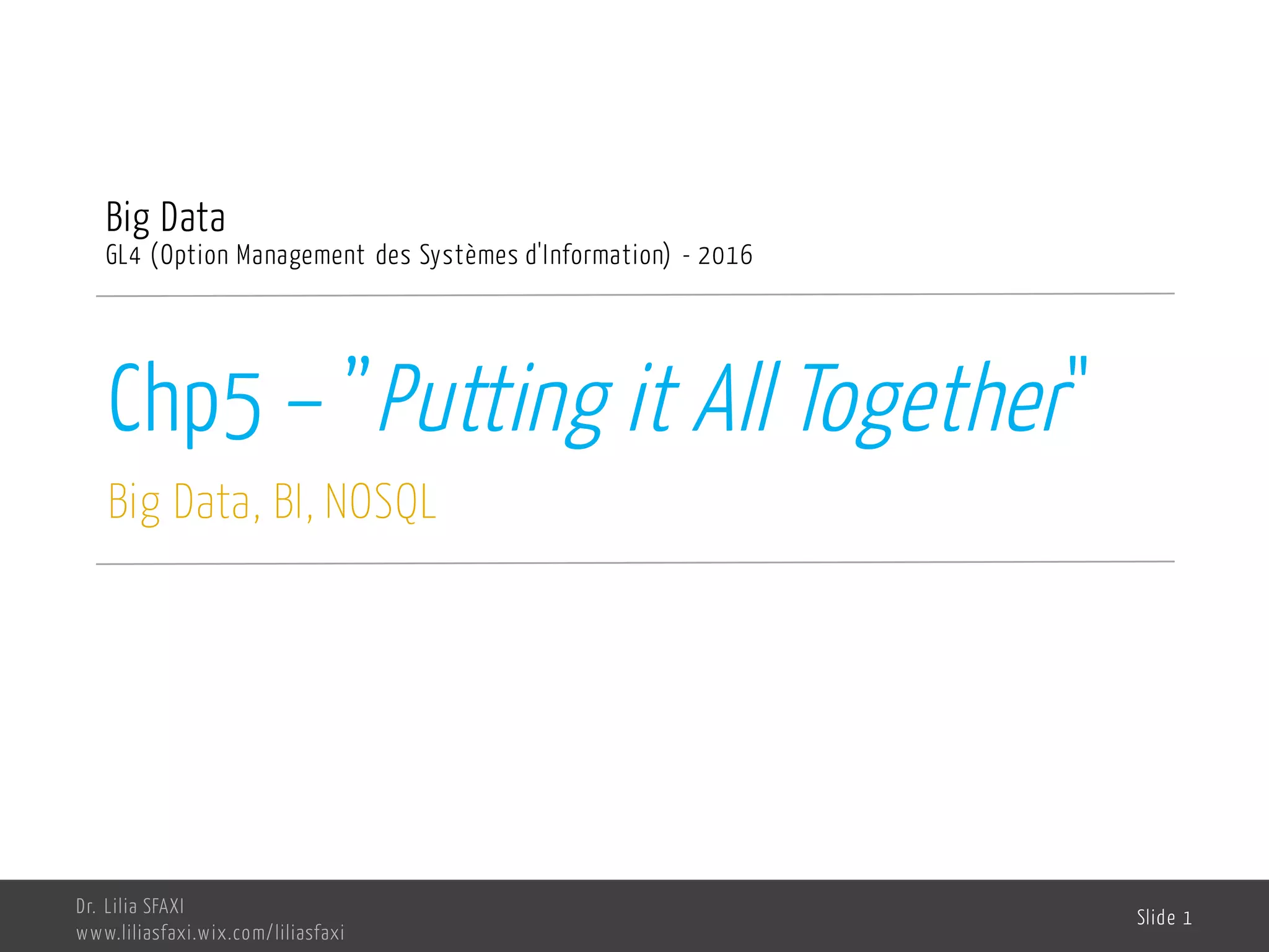 Le document examine les différentes approches de gestion des données à grande échelle, notamment l'utilisation de SQL et NoSQL pour répondre aux besoins opérationnels et analytiques des entreprises. Il met en lumière l'importance de choisir la technologie en fonction des spécificités métier et de la nature des données, tout en considérant l'évolution des besoins. En outre, il discute des méthodes d'intégration entre NoSQL et les outils de business intelligence pour tirer parti des avantages de chaque système.