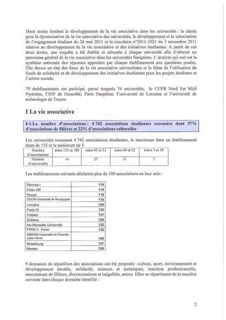 Le document présente un bilan de l'utilisation du Fonds de solidarité et de développement des initiatives étudiantes (FSDIE) pour l'année universitaire 2011-2012 en France, en détaillant l'état des lieux de la vie associative dans les universités. Une enquête menée auprès de 79 établissements a révélé l'existence de 4 742 associations étudiantes, avec une majorité d'entre elles étant des associations de filières et culturelles. Les universités communiquent largement sur la vie associative, attribuent des aides et accompagnent les porteurs de projets, bien que la formation des étudiants engagés reste limitée.