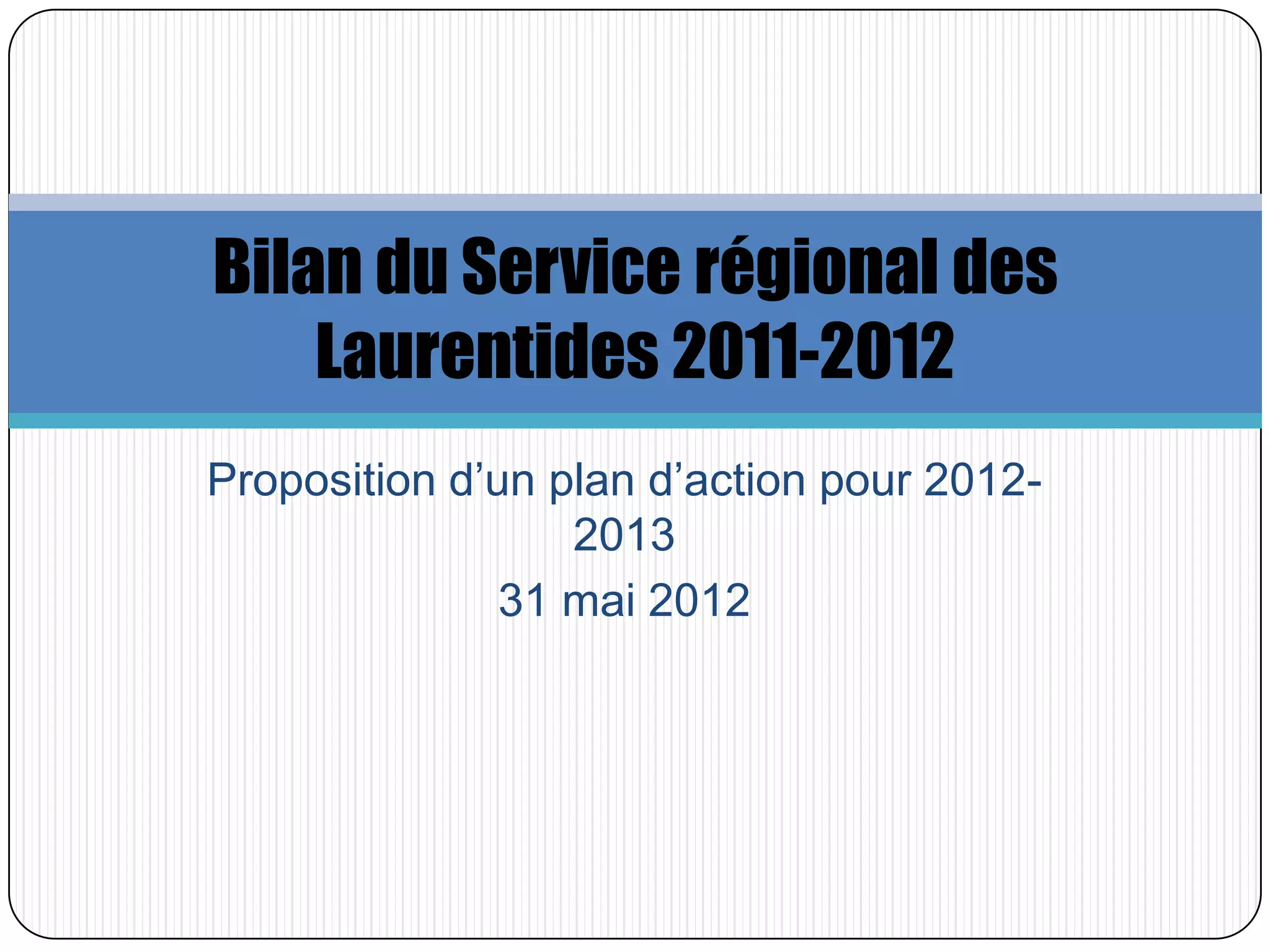 Le bilan du service régional des Laurentides pour 2011-2012 présente les actions menées pour soutenir le développement des compétences professionnelles auprès des enseignants, notamment à travers des formations et des accompagnements diversifiés. Le document soulève également des préoccupations concernant l'intégration des nouvelles technologies et stipule un plan d'action pour 2012-2013 visant à renforcer cette approche tout en favorisant la collaboration entre enseignants. Un budget prévisionnel est établi pour l'année à venir, reflétant les priorités d'accompagnement et de formation dans le cadre du renouvellement pédagogique.