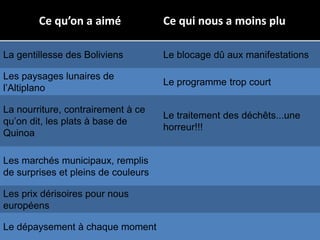 Le document présente une expérience de voyage en Bolivie, mettant en avant la gentillesse des habitants, les paysages spectaculaires et les particularités culturelles. Cependant, il souligne aussi les défis rencontrés comme les manifestations et un programme trop ambitieux pour 15 jours. Finalement, malgré un budget plus élevé que prévu, le voyage pourrait être géré pour environ 60€ par jour pour deux personnes.
