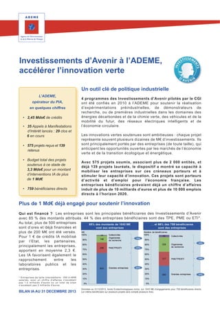 L'Ademe, en tant qu'opérateur du PIA, a mobilisé 2,45 milliards d'euros pour soutenir des projets d'innovation verte, avec 139 projets retenus sur 575 soumis, générant un potentiel de 10 milliards d'euros de chiffre d'affaires et plus de 10 000 emplois d'ici 2020. Quatre programmes principaux abordent des thématiques comme les énergies décarbonées, les véhicules du futur et l'économie circulaire, favorisant des synergies entre entreprises et laboratoires de recherche. Les initiatives incluent des projets emblématiques tels que le développement de technologies pour les réseaux électriques intelligents et les énergies renouvelables, contribuant à la transition énergétique et écologique en France.