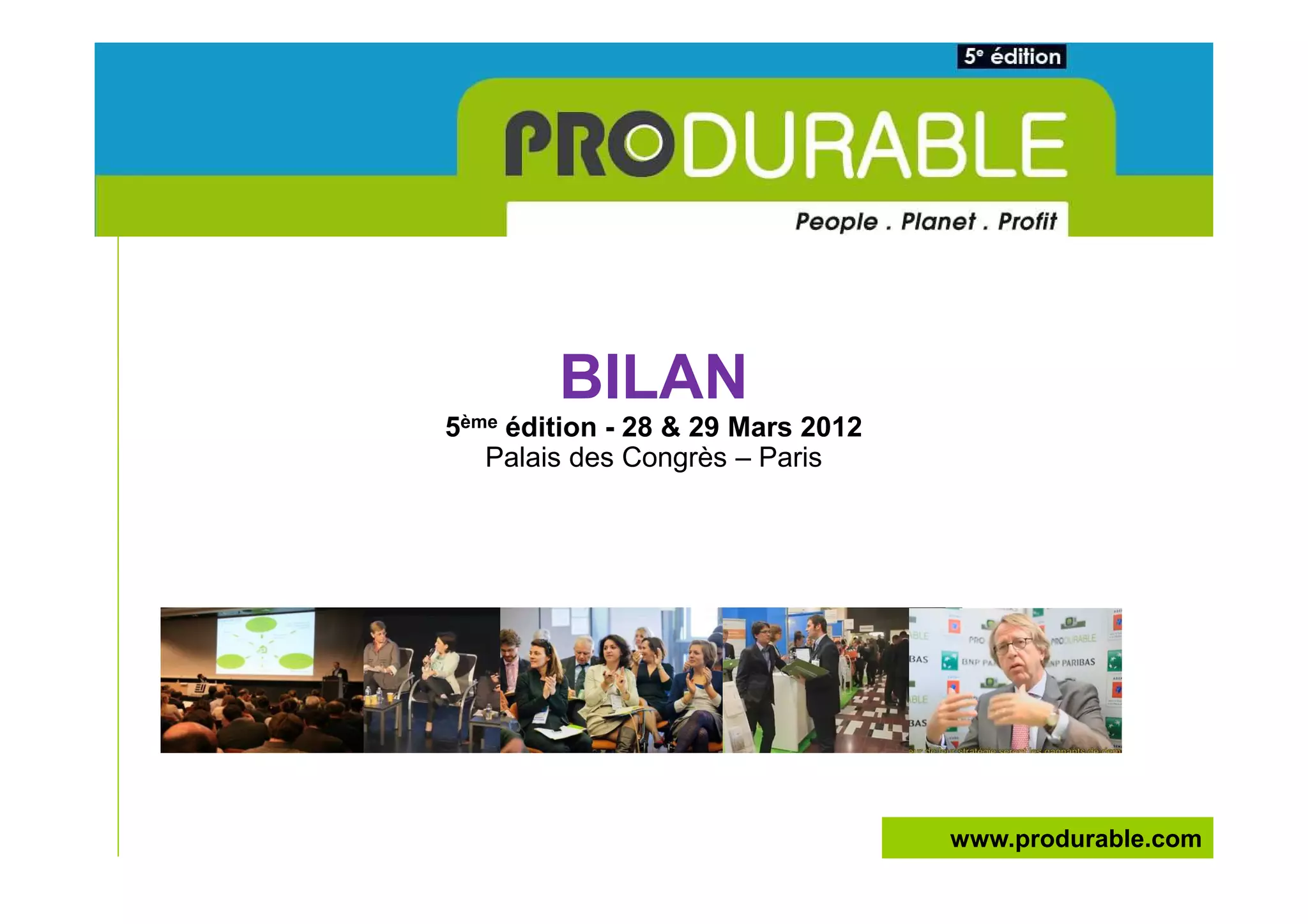 La 5ème édition de Produrable, tenue les 28 et 29 mars 2012 à Paris, a rassemblé 2800 professionnels autour de la responsabilité sociétale des entreprises (RSE) et du développement durable, avec 45 conférences et la participation de 122 intervenants experts. L'événement a connu un taux de satisfaction élevé parmi les visiteurs, avec 84% d'entre eux se disant satisfaits de la qualité des présentations et des contacts établis. Produrable se positionne comme un événement clé en France sur les thématiques de la RSE, intégrant un congrès, une exposition et de nombreuses conférences.