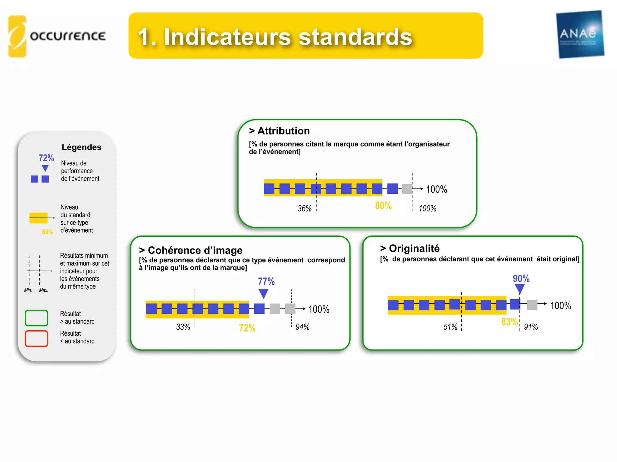 Le document présente des indicateurs de performance pour des événements, évaluant des critères tels que l'attribution de la marque, la satisfaction des participants et l'incitation à l'achat. Les résultats montrent une variabilité dans la perception de l'originalité et de la proximité avec la marque, avec un maximum de 100% sur certains critères. Une étude de performance des animations en magasin a également été mentionnée, impliquant un groupe test et un groupe témoin.