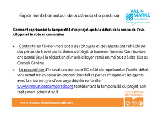 Le projet Innovations Democratic vise à favoriser l'émergence de nouvelles pratiques démocratiques locales en intégrant le numérique et le design de services. Il inclut des expérimentations pour faciliter la participation citoyenne, notamment par des outils collaboratifs et des ateliers, tout en abordant les défis liés à l'appropriation numérique. Le projet souligne l'importance de l'implication des citoyens peu mobilisés et promeut la co-construction de débats en ligne avec les parties prenantes.
