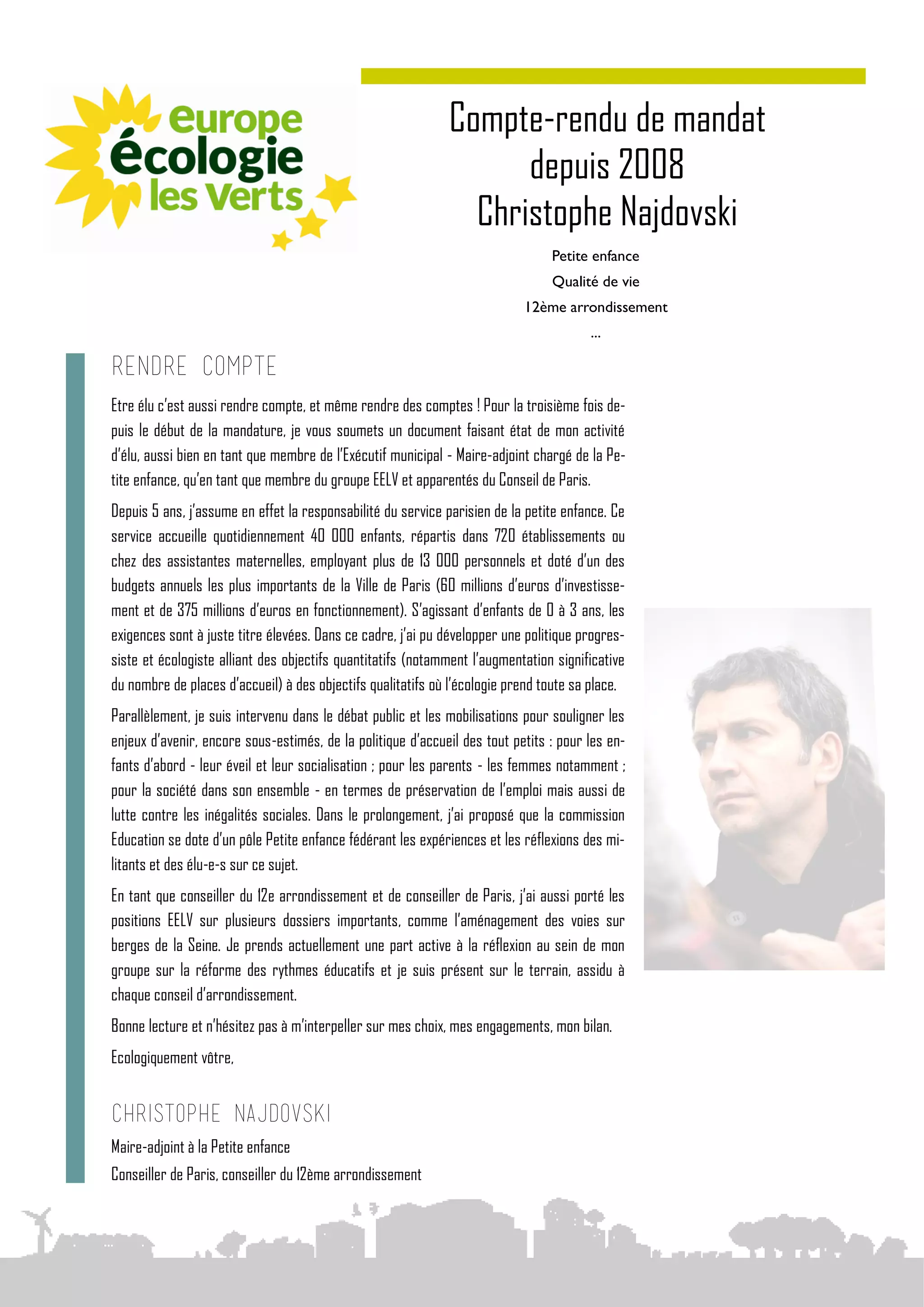 Christophe Najdovski, maire-adjoint chargé de la petite enfance, présente un compte-rendu de son mandat depuis 2008, soulignant ses efforts pour améliorer l'accueil des enfants à Paris, qui inclut l'ouverture de nouvelles crèches et l'intégration d'une approche écologique. Il met en avant l'importance de la conciliation vie professionnelle et familiale pour les parents, ainsi que la nécessité de garantir une éducation de qualité pour les jeunes enfants, notamment ceux en situation de handicap. Najdovski appelle à un dialogue continu avec les parents et les élus pour renforcer les initiatives en faveur de la petite enfance.