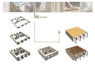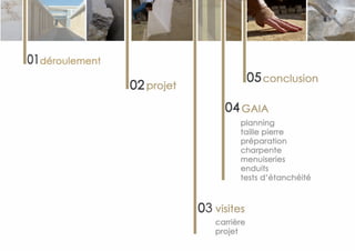 Le document décrit l'organisation d'un chantier de construction utilisant divers types de pierres, mettant en avant les étapes de taille et d'assemblage ainsi que les outils employés. Il présente également des projets architecturaux tels qu'un chai viticole, illustrant l'intégration harmonieuse de nouveaux bâtiments avec leur environnement et les techniques de construction durable. Enfin, le document évoque la notion de savoir-faire artisanal, distinct des autres formes de connaissance, et le rôle de la main dans le travail de l'artisan.