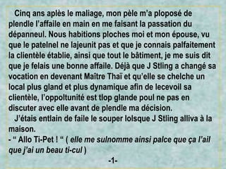 Dans ce chapitre, le narrateur évoque la décision de reprendre le dépanneur de son père après une discussion. Sa compagne réagit positivement à cette nouvelle, tout en exprimant son propre désir d'expansion de son entreprise. Finalement, le narrateur acquiert les clés du dépanneur, marquant le début d'une nouvelle étape dans sa vie professionnelle.