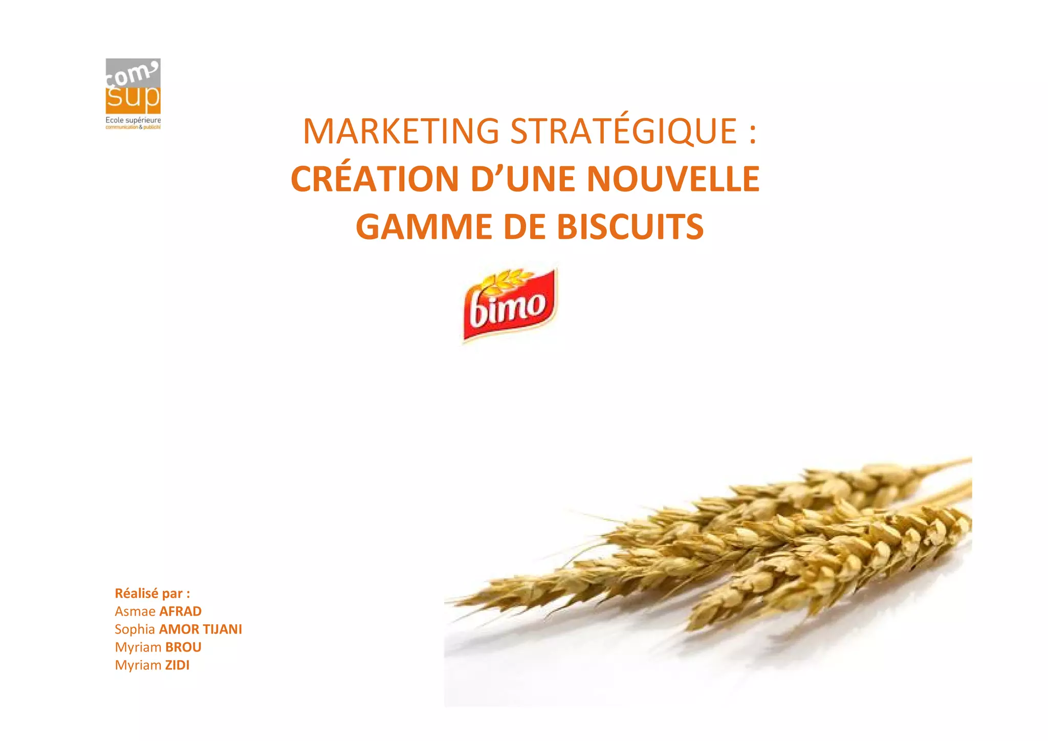 Le document présente une analyse détaillée du marché de la biscuiterie au Maroc, y compris la segmentation, l'état de l'offre et un examen SWOT. Il met également en lumière l'entreprise Bimo, ses cibles, sa stratégie de marketing, ainsi qu'une proposition pour un nouveau produit orienté vers le bien-être et la santé. Enfin, il inclut une stratégie commerciale pour le lancement de biscuits au café répondant à une demande croissante pour les produits sains.