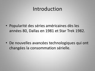 Le document analyse l'émergence du binge-watching, phénomène amplifié par des plateformes comme Netflix, et son impact sur le mode de consommation des séries télévisées. Il souligne les motivations sociales derrière cette pratique, ainsi que ses conséquences, allant de la peur du spoil à des préoccupations plus sérieuses comme la dépendance. Les résultats d'enquêtes révèlent les séries les plus regardées en binge et les recommandations des médias pour maximiser cette expérience.