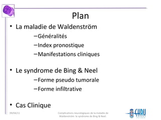 La maladie de Waldenström est une hémopathie lymphoïde de bas grade avec des manifestations neurologiques, notamment le syndrome de Bing-Neel, qui se manifeste par des formes pseudo-tumorales et infiltratives. Les complications neurologiques peuvent inclure des troubles cognitifs, des crises d'épilepsie, et des déficits focaux, souvent liés à une infiltration lymphocytaire. Le diagnostic repose sur la présence d'igm monoclonales dans le LCR et le traitement implique des chimiothérapies spécifiques.