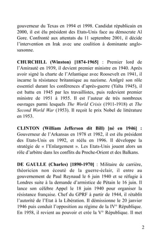 Le document présente des biographies essentielles de figures historiques influentes du XXe siècle, allant de philosophes comme Raymond Aron à des dirigeants politiques tels que Franklin D. Roosevelt et Oussama Ben Laden. Chacune de ces biographies détaille leur parcours, leurs contributions et leur impact sur l'histoire mondiale. Les thèmes abordés incluent la guerre, la politique, et les mouvements sociaux.