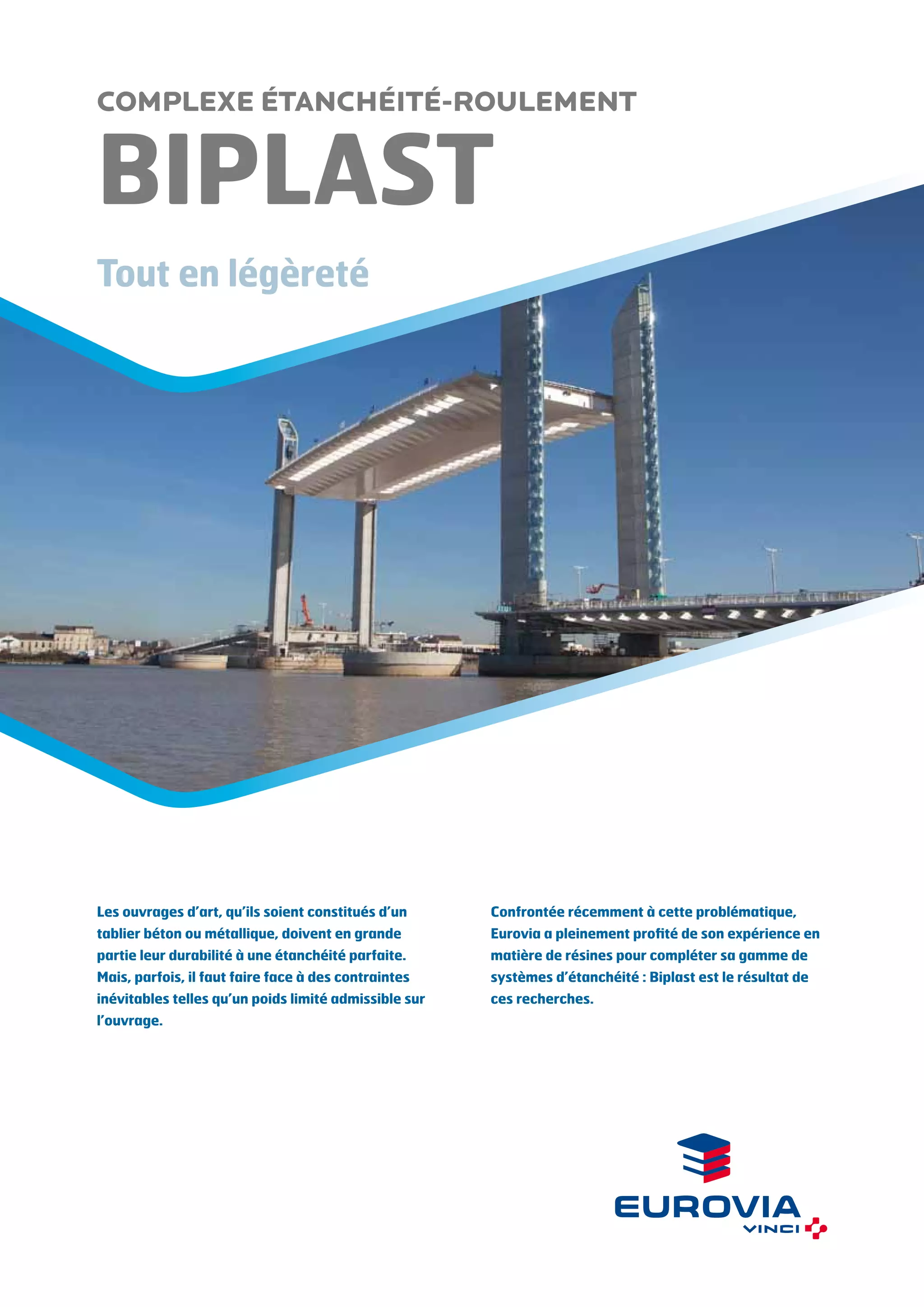 Biplast est un nouveau système d'étanchéité léger développé par Eurovia, adapté aux ouvrages d'art en réduisant le poids à moins de 20 kg/m2. Composé d'un complexe bicouche à base de résine époxy-bitume, il offre rapidité d'application et excellente adhérence grâce à des granulats spécifiques. Ce système a été certifié pour son utilisation sur des ponts à dalle orthotrope, fournissant à la fois étanchéité et roulement.