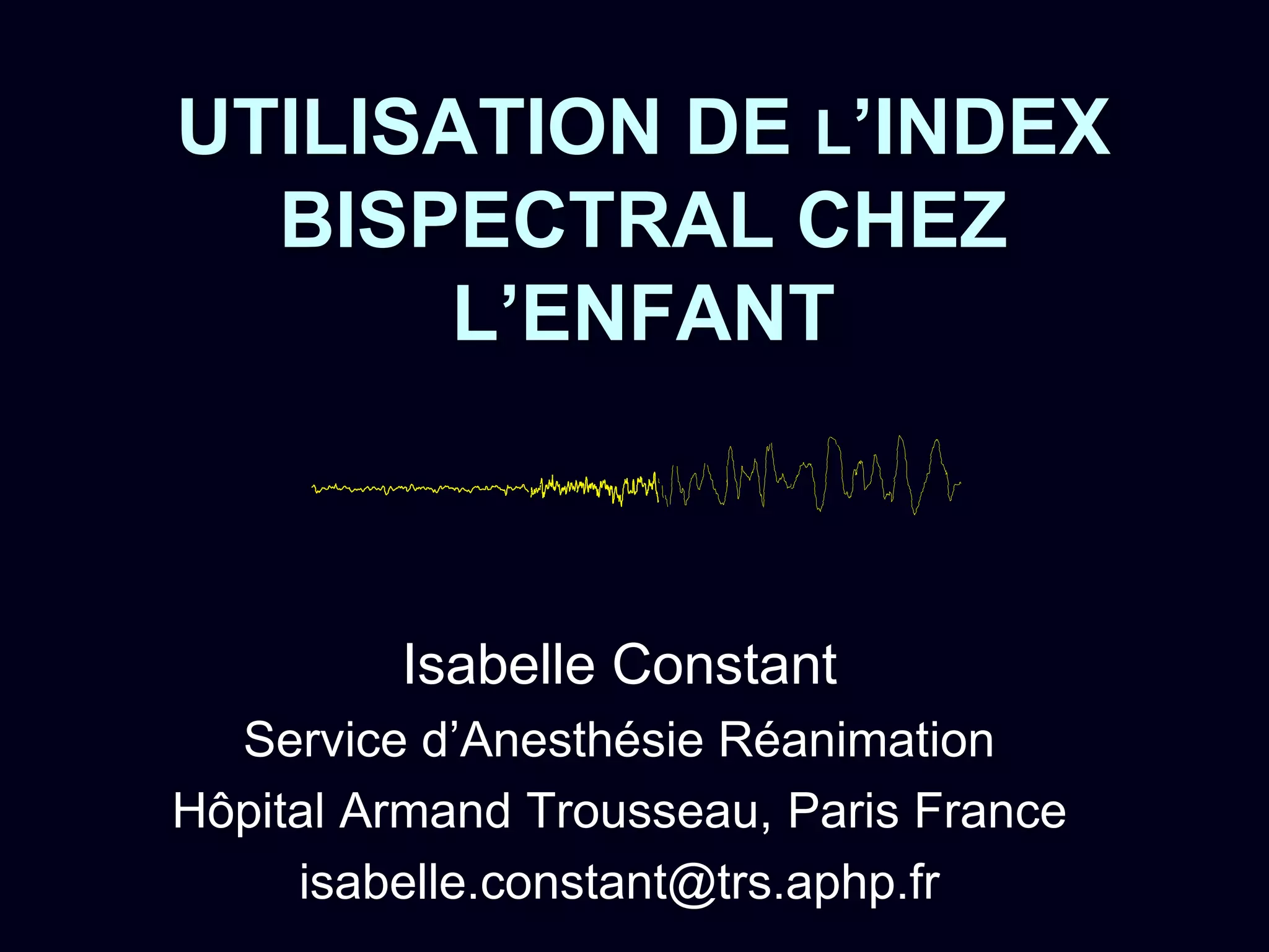 Ce document traite de l'utilisation de l'index bispectral (BIS) pour surveiller la profondeur de l'anesthésie chez les enfants et les nourrissons, soulignant que l'awareness peropératoire est plus fréquente chez les enfants que chez les adultes. Il aborde également les effets neurotoxiques des agents anesthésiques sur le développement cérébral, en insistant sur la nécessité d'une surveillance EEG pour améliorer la pratique clinique. En conclusion, bien que les moniteurs EEG offrent des informations utiles, certains processus cérébraux sous-jacents restent inexplorés.