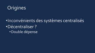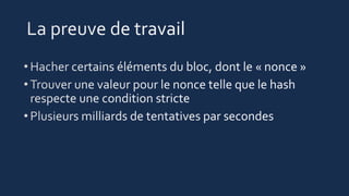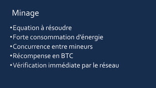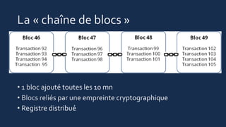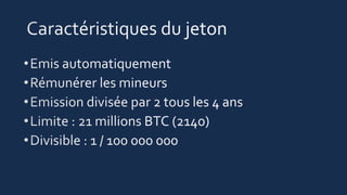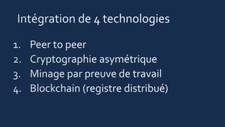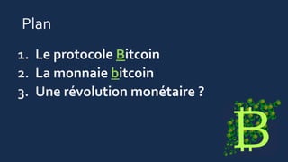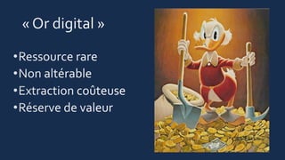 Le document aborde le concept du bitcoin en tant que monnaie basée sur un actif intangible et explore son intégration dans le système de paiement à travers des thèmes tels que la bancarisation et la protection contre l'inflation. Il traite également de la multiplication des cryptomonnaies et questionne l'avenir des politiques monétaires. En somme, il analyse les impacts et enjeux de l'évolution des monnaies numériques.