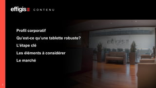 Le document présente un guide sur les tablettes robustes, mettant en avant leur définition, les éléments à considérer lors de leur choix et le marché actuel. Il souligne l'importance d'identifier le contexte d'utilisation et les besoins spécifiques pour sélectionner l'équipement approprié. Un outil de comparaison est suggéré pour aider à naviguer dans ce marché en pleine expansion.