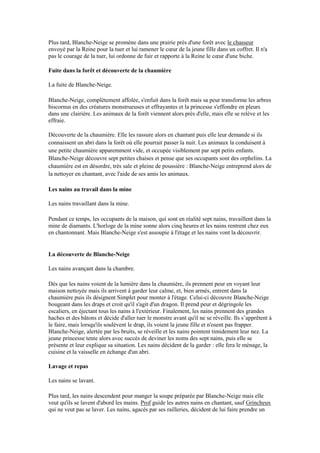 Blanche-Neige et les Sept Nains est le premier long-métrage de Walt Disney sorti en 1937, racontant l'histoire d'une princesse jalousée par sa marâtre. Après avoir fui dans la forêt, elle trouve refuge chez sept nains qui l'accueillent, mais la reine, se déguisant en sorcière, lui offre une pomme empoisonnée. Finalement, après un long sommeil causé par le poison, Blanche-Neige est réveillée par le baiser de son prince, et ils s'en vont ensemble vers un château.