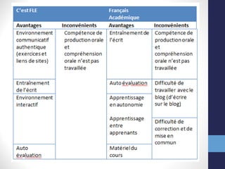 Ce document explore l'utilisation des blogs dans le cadre de l'enseignement, notamment leur définition, leur succès, et les contraintes associées. Il souligne les avantages pédagogiques des blogs, tels que l'autonomie et l'interaction, tout en mentionnant les difficultés liées à leur mise en œuvre en classe. La conclusion met l'accent sur l'importance de préparer les élèves et de maintenir leur motivation pour obtenir des résultats fructueux.