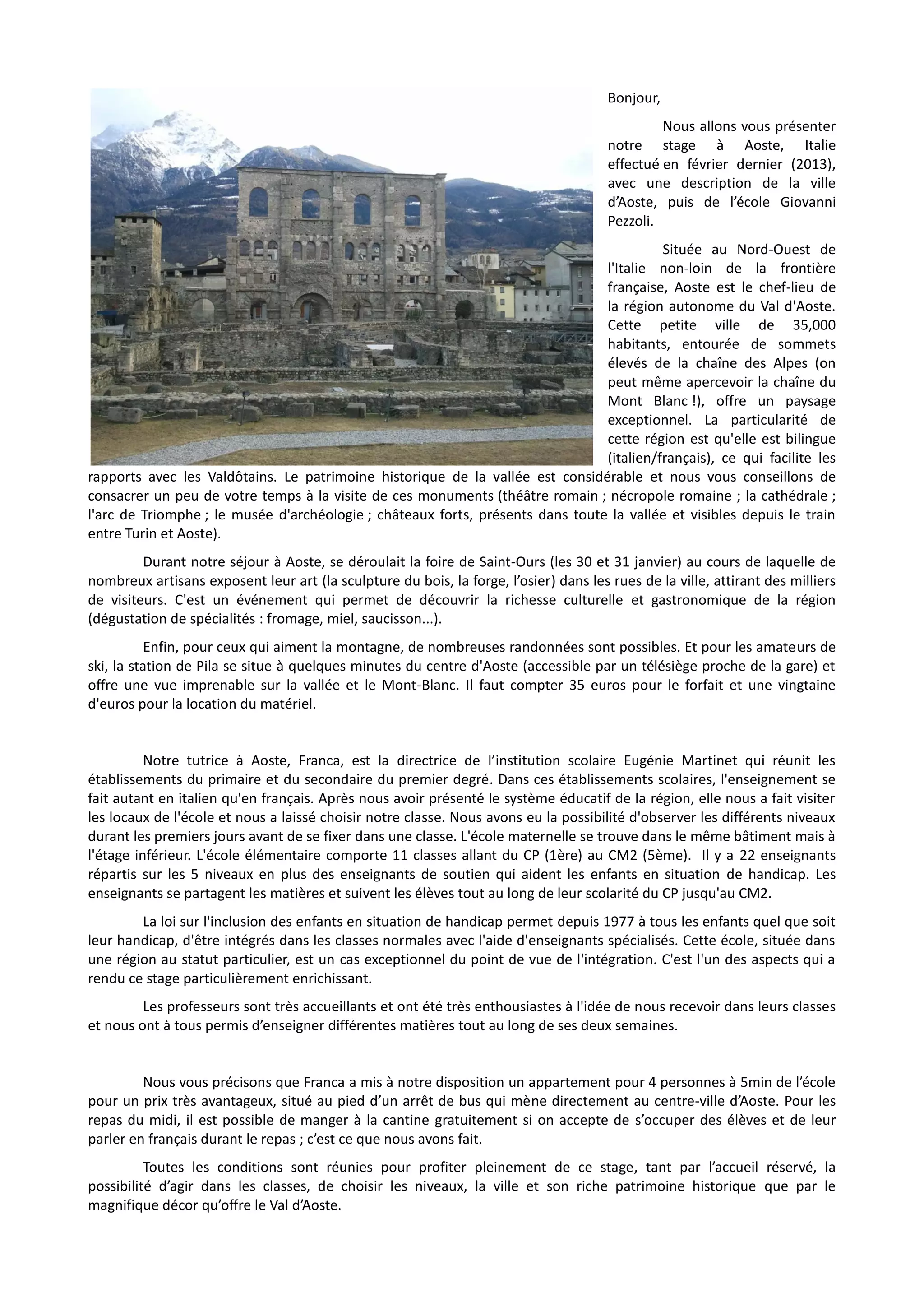 Le document présente un stage à Aoste, en Italie, effectué en février 2013, décrivant la ville, son environnement bilingue, et son riche patrimoine historique. L'école Giovanni Pezzoli, dirigée par Franca, permet aux étudiants d'observer et d'enseigner dans des classes où l'inclusion des élèves handicapés est encouragée. En plus des activités scolaires, la région offre des événements culturels, des spécialités gastronomiques, ainsi que des opportunités de randonnée et de ski.