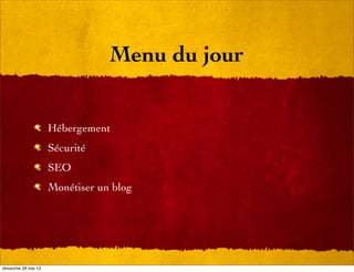 Le document aborde divers aspects techniques pour monétiser un blog, y compris le choix de l'hébergement, la sécurité, et l'optimisation SEO. Il propose des stratégies pour augmenter le trafic, gérer le spam, et publier du contenu régulièrement. Enfin, il évoque la rentabilité du blog en convertissant l'audience en clients à travers la publicité et d'autres services.
