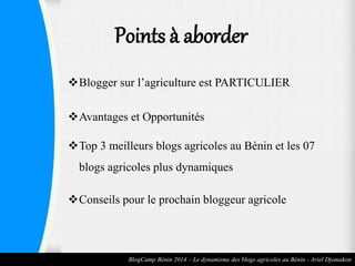 Le document présente le dynamisme des blogs agricoles au Bénin, discutant des avantages, des opportunités et des conseils pour les blogueurs. Il mentionne les trois meilleurs blogs agricoles et six autres blogs dynamiques, abordant divers thèmes liés à l'agriculture. Le contenu encourage les passionnés à partager leurs connaissances tout en explorant des thématiques spécifiques.